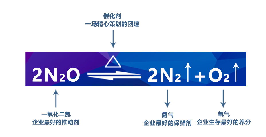安圖歐取自N2O,化學(xué)名稱一氧化二氮,在室溫下穩(wěn)定,高溫下分解成氮氣和氧氣,企業(yè)通過N2O-X團隊設(shè)計的團建活動使企業(yè)團隊內(nèi)部升溫。氮氣(N2)喻為團隊的穩(wěn)定劑及保鮮劑,氧氣(O2)則為團隊助燃劑注入企業(yè)新鮮活力,通過一場定制化的團隊建設(shè)體驗使兩者組合成為企業(yè)成長的不斷動力,而X則代表著企業(yè)發(fā)展的無限可能性,也是作為企業(yè)、員工與活動之間的連通符號和橋梁。
