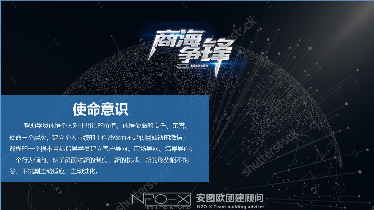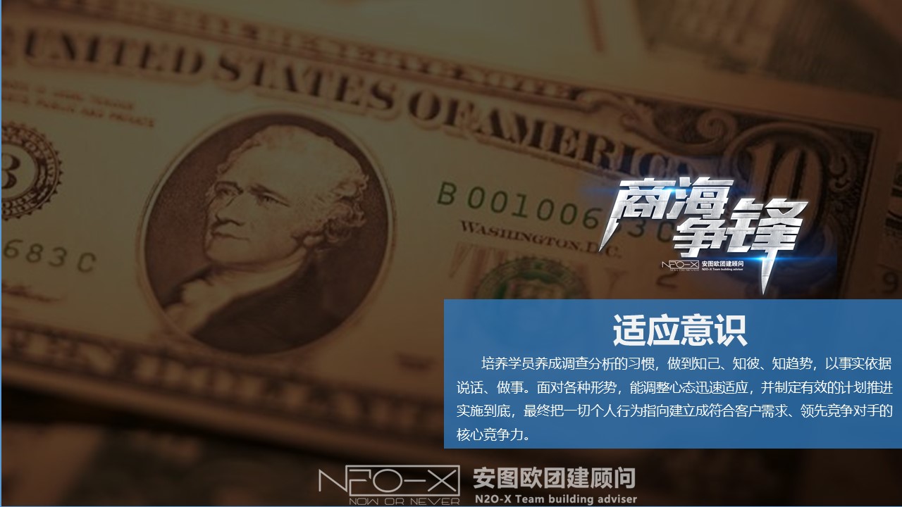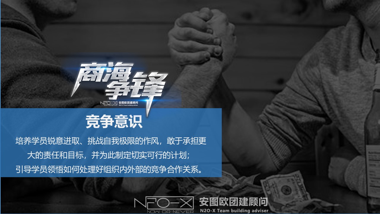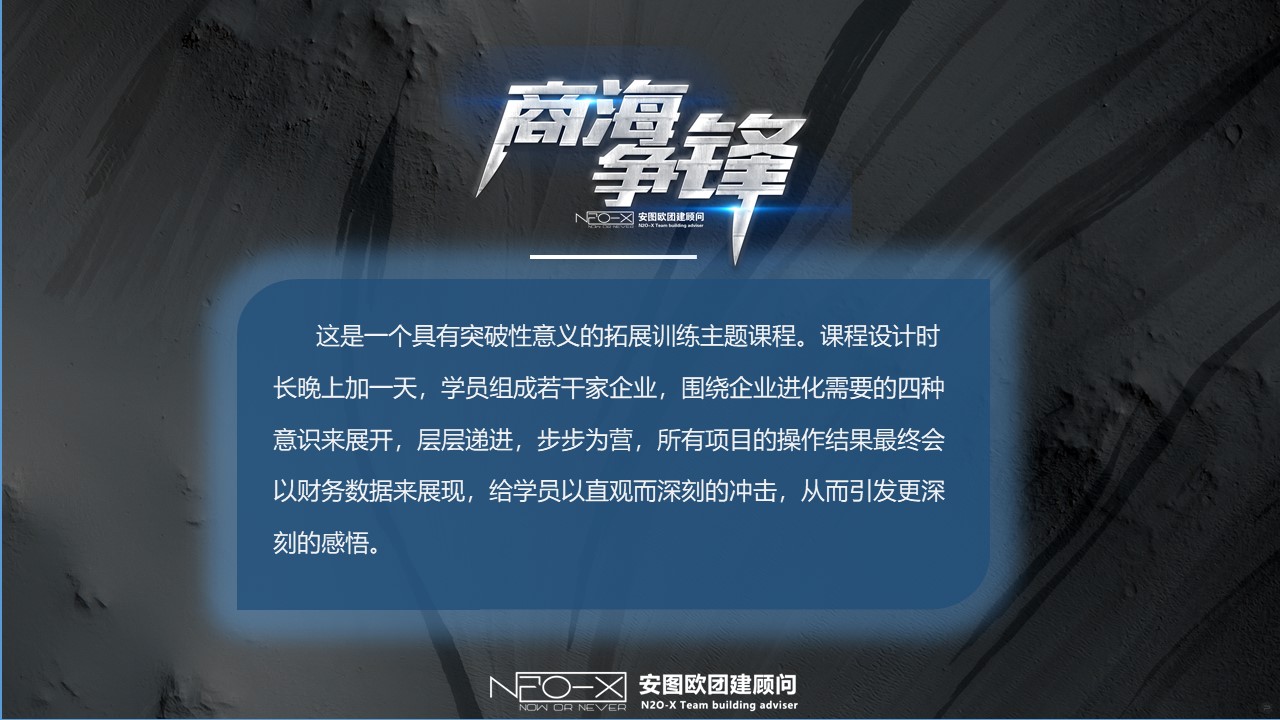這是一個具有突破性意義的拓展訓(xùn)練主題課程。課程設(shè)計時長晚上加一天,學(xué)員組成若干家企業(yè),圍繞企業(yè)進化需要的四種意識來展開,層層遞進,步步為營,所有項目的操作結(jié)果最終會以財務(wù)數(shù)據(jù)來展現(xiàn),給學(xué)員以直觀而深刻的沖擊,從而引發(fā)更深刻的感悟。