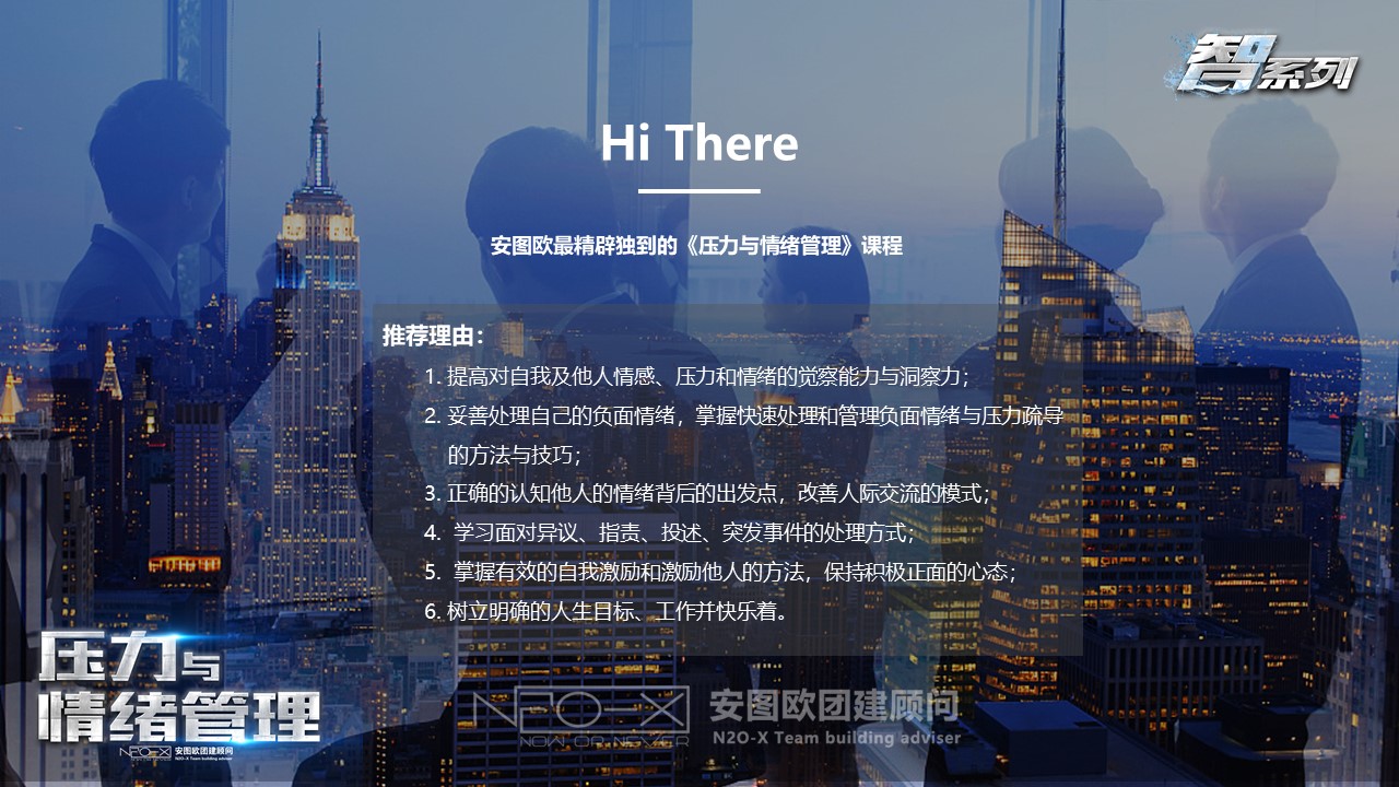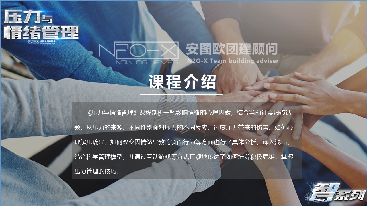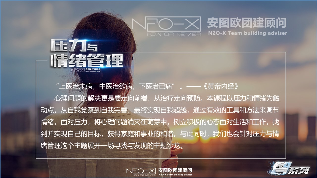 心理問(wèn)題的解決更是要走向前端,從治療走向預(yù)防。本課程以壓力和情緒為觸動(dòng)點(diǎn),從自我覺(jué)察到自我完善,最終實(shí)現(xiàn)自我超越,通過(guò)有效的工具和方法來(lái)調(diào)節(jié)情緒,面對(duì)壓力,將心理問(wèn)題消滅在萌芽中,樹(shù)立積極的心態(tài)面對(duì)生活和工作,找到并實(shí)現(xiàn)自己的目標(biāo),獲得家庭和事業(yè)的和諧。與此同時(shí),我們也會(huì)針對(duì)壓力與情緒管理這個(gè)主題展開(kāi)一場(chǎng)尋找與發(fā)現(xiàn)的主題沙龍。