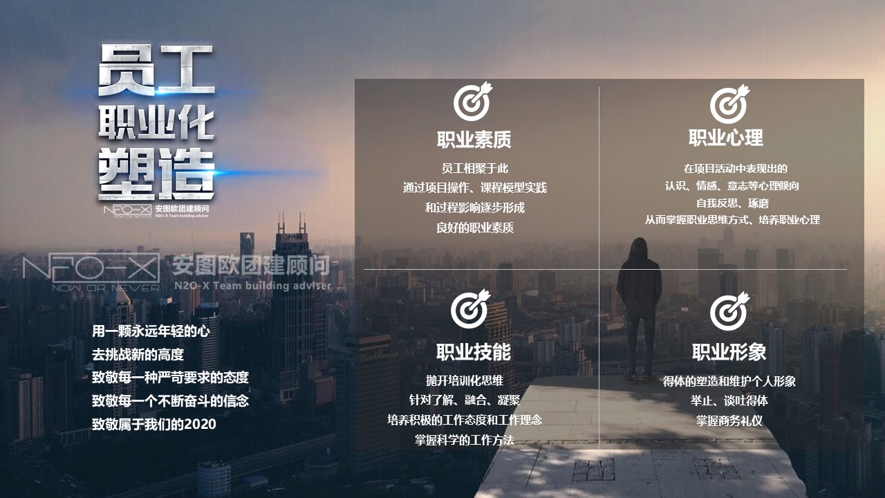 針對企業(yè)改制和走向成功過程中所面臨的員工職業(yè)素質(zhì)和職業(yè)行為規(guī)范全面提升的問題,提出全面的職業(yè)化塑造的思維、方法及技巧,通過分析企業(yè)、員工所面臨的內(nèi)、外部因素,找到干擾和壓力源,從個人價值觀和態(tài)度、職業(yè)化技能三個層面全面剖析,通過團建項目進行實戰(zhàn)職業(yè)化塑造。打破原有陳舊的職業(yè)觀念,促進員工形成積極的工作態(tài)度,確保其掌握符合公司要求的職業(yè)化素質(zhì)和職業(yè)化行為規(guī)范。