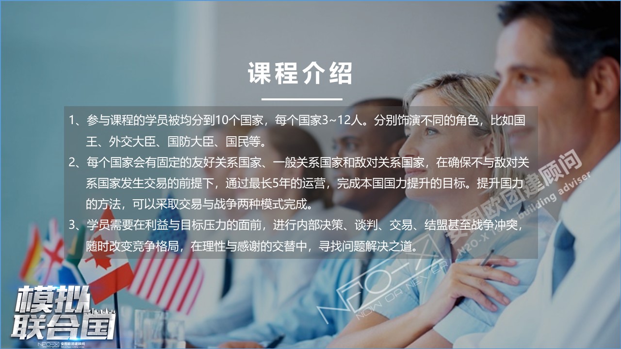1、參與課程的學(xué)員被均分到10個(gè)國家,每個(gè)國家3~12人。分別飾演不同的角色,比如國王、外交大臣、國防大臣、國民等。