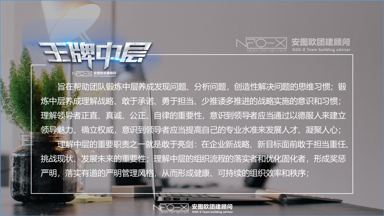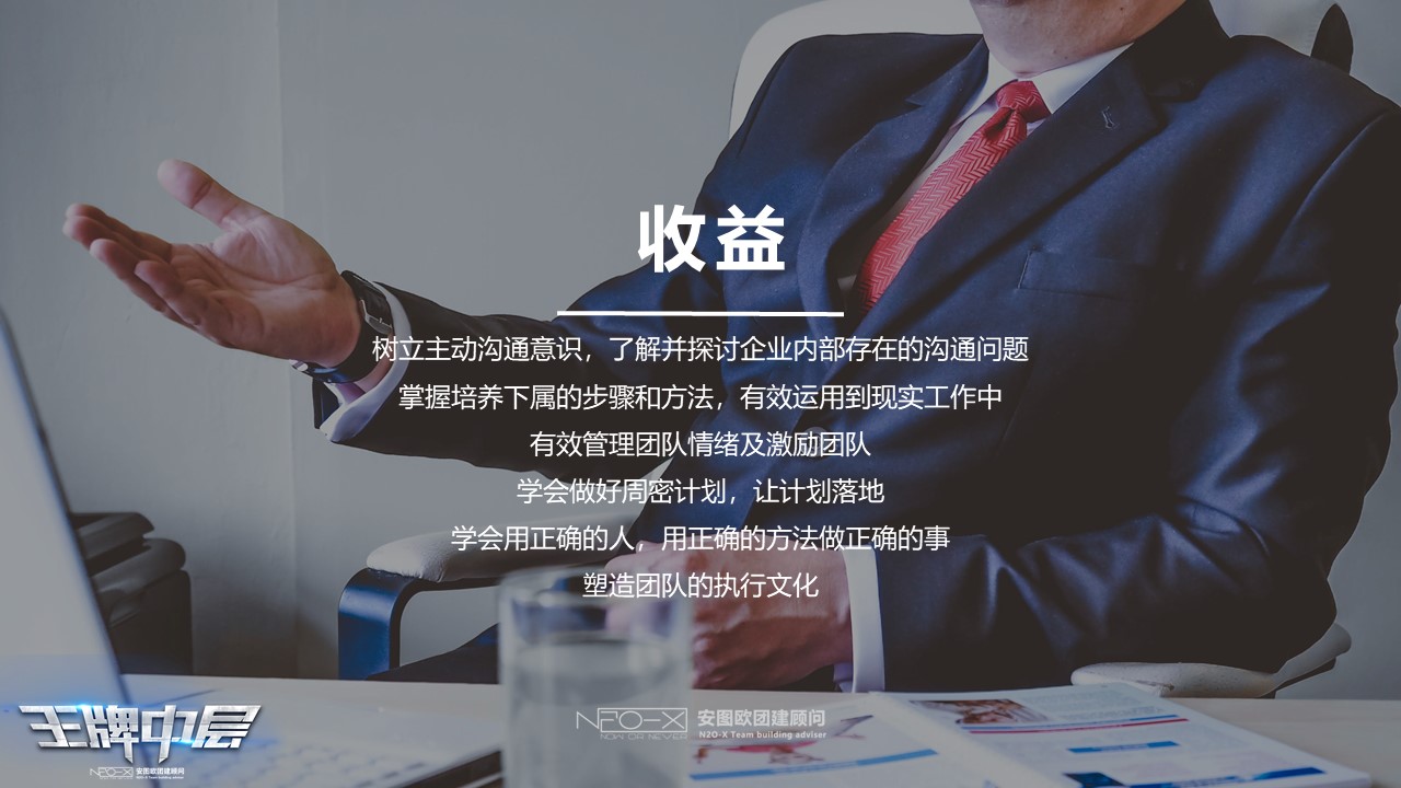 旨在幫助團(tuán)隊(duì)鍛煉中層養(yǎng)成發(fā)現(xiàn)問題、分析問題,創(chuàng)造性解決問題的思維習(xí)慣;鍛煉中層養(yǎng)成理解戰(zhàn)略、敢于承諾、勇于擔(dān)當(dāng)、少推諉多推進(jìn)的戰(zhàn)略實(shí)施的意識(shí)和習(xí)慣;理解領(lǐng)導(dǎo)者正直、真誠(chéng)、公正、自律的重要性,意識(shí)到領(lǐng)導(dǎo)者應(yīng)當(dāng)通過以德服人來建立領(lǐng)導(dǎo)魅力、確立權(quán)威,意識(shí)到領(lǐng)導(dǎo)者應(yīng)當(dāng)提高自己的專業(yè)水準(zhǔn)來發(fā)展人才、凝聚人心;