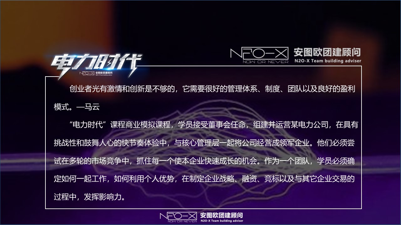 “電力時(shí)代”課程商業(yè)模擬課程,學(xué)員接受董事會任命,組建并運(yùn)營某電力公司,在具有挑戰(zhàn)性和鼓舞人心的快節(jié)奏體驗(yàn)中,與核心管理層一起將公司經(jīng)營成領(lǐng)軍企業(yè)。他們必須嘗試在多輪的市場競爭中,抓住每一個(gè)使本企業(yè)快速成長的機(jī)會。作為一個(gè)團(tuán)隊(duì),學(xué)員必須確定如何一起工作,如何利用個(gè)人優(yōu)勢,在制定企業(yè)戰(zhàn)略、融資、競標(biāo)以及與其它企業(yè)交易的過程中,發(fā)揮影響力。