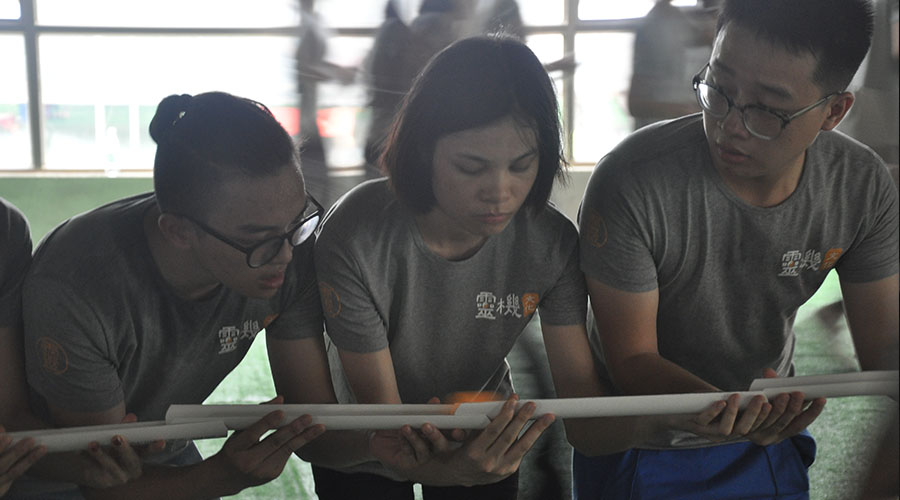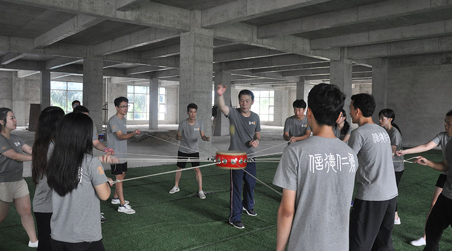 學(xué)員們利用特制的一面鼓,每個(gè)隊(duì)友都牽拉著其中一條繩子。通過控制繩子來控制鼓面顛球,創(chuàng)造盡可能多的顛球記錄。
