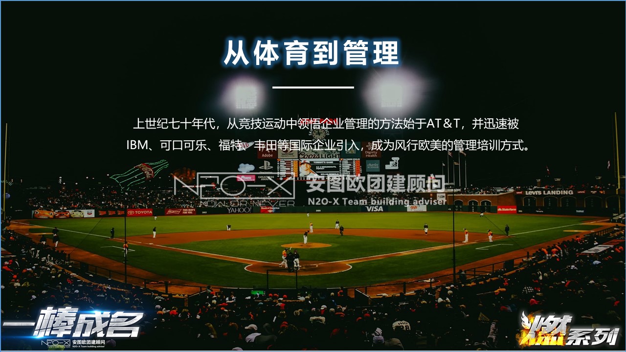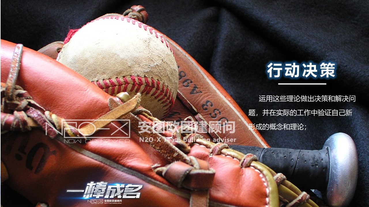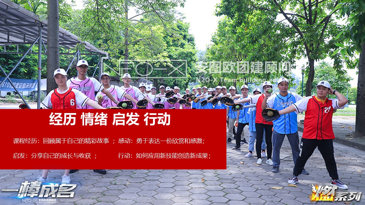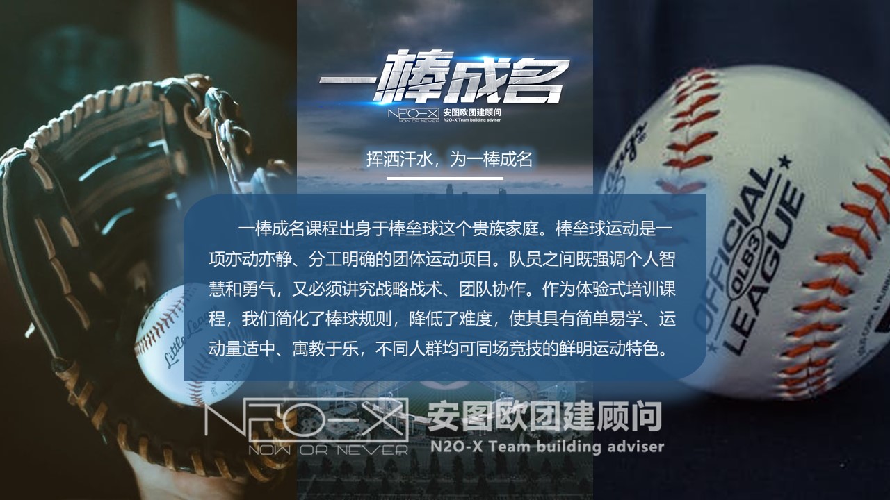 一棒成名課程出身于棒壘球這個貴族家庭。棒壘球運動是一項亦動亦靜、分工明確的團體運動項目。隊員之間既強調個人智慧和勇氣,又必須講究戰(zhàn)略戰(zhàn)術、團隊協(xié)作。作為體驗式培訓課程,我們簡化了棒球規(guī)則,降低了難度,使其具有簡單易學、運動量適中、寓教于樂,不同人群均可同場競技的鮮明運動特色。