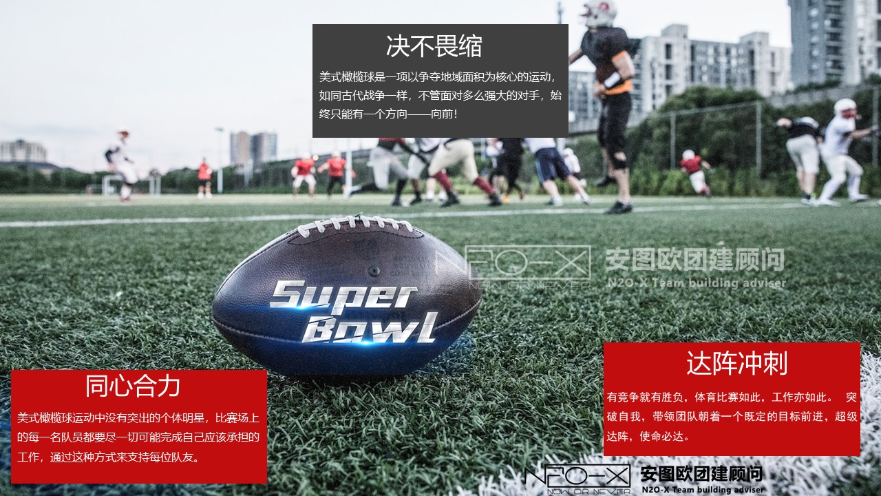 橄欖球是一個全身性的團(tuán)隊(duì)運(yùn)動,在場上不只是一個人在運(yùn)動,每個隊(duì)員要設(shè)法阻止或保持住球,由此產(chǎn)生極其縝密的戰(zhàn)術(shù)配合,對于企業(yè)培訓(xùn)可以讓員工的思維、注意力、執(zhí)行力、團(tuán)隊(duì)配合能力、團(tuán)隊(duì)溝通能力會比其他的運(yùn)動提升更多,由于是高強(qiáng)度的體能運(yùn)動也會激發(fā)出無限的潛能。