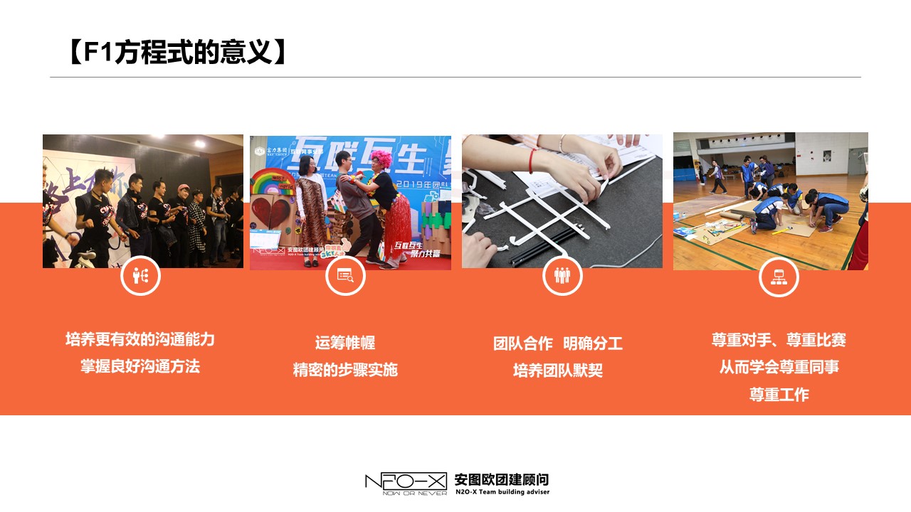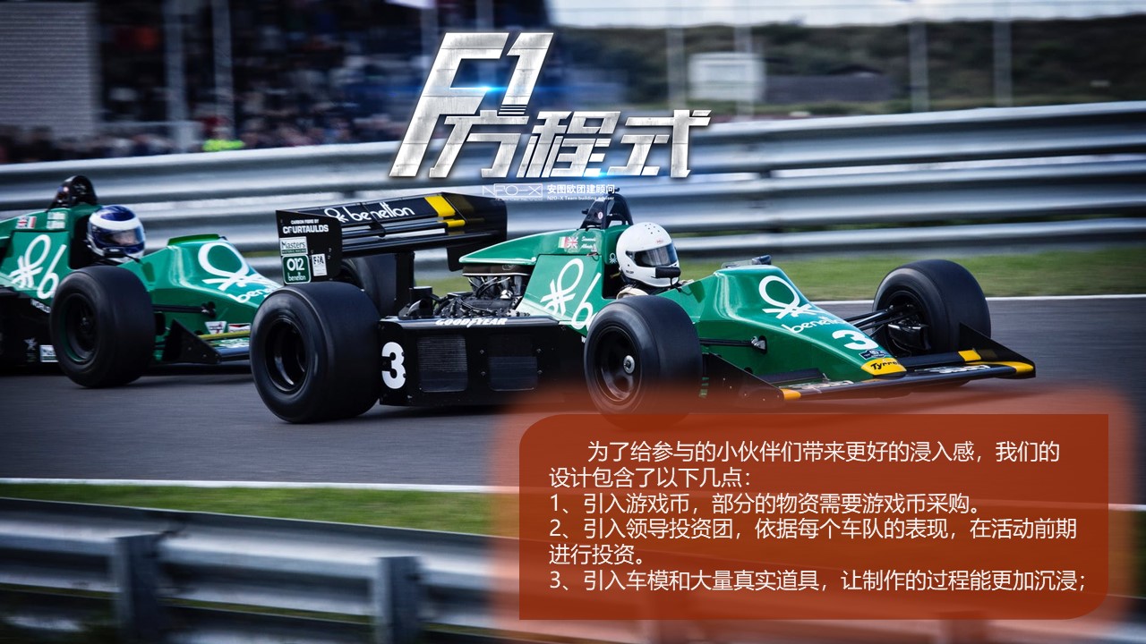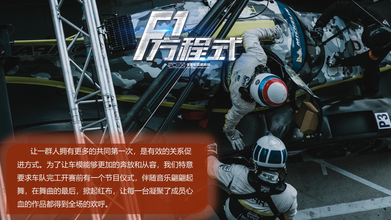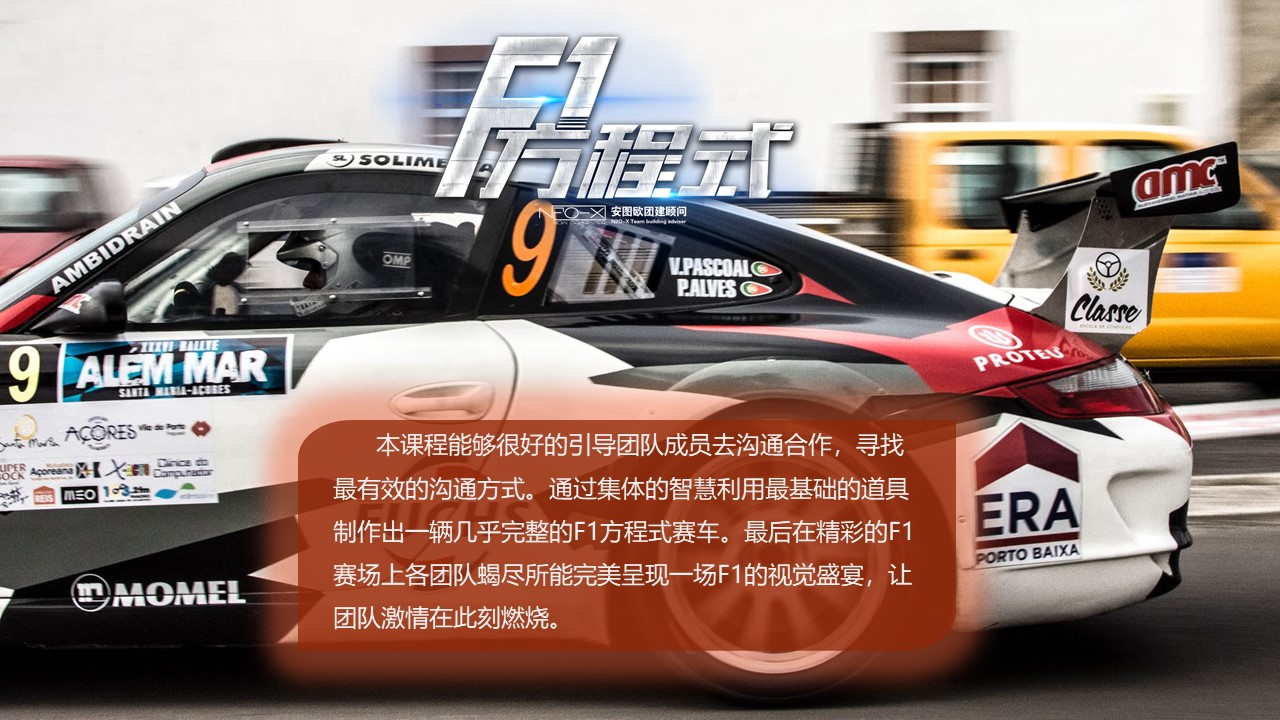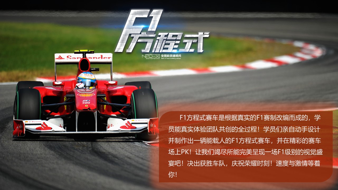 本課程能夠很好的引導(dǎo)團隊成員去溝通合作,尋找最有效的溝通方式。通過集體的智慧利用最基礎(chǔ)的道具制作出一輛幾乎完整的F1方程式賽車。最后在精彩的F1賽場上各團隊蝎盡所能完美呈現(xiàn)一場F1的視覺盛宴,讓團隊激情在此刻燃燒。