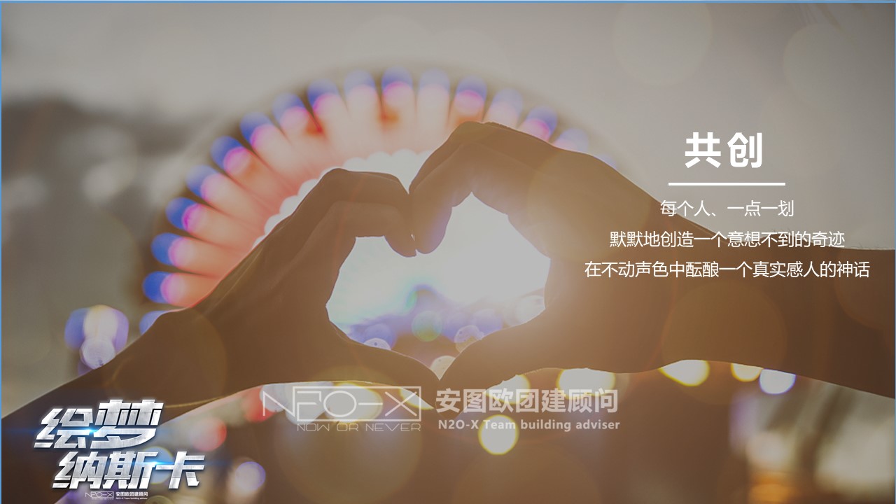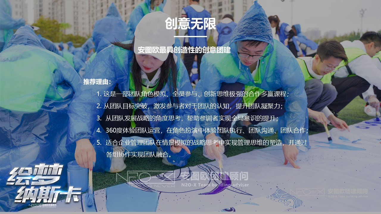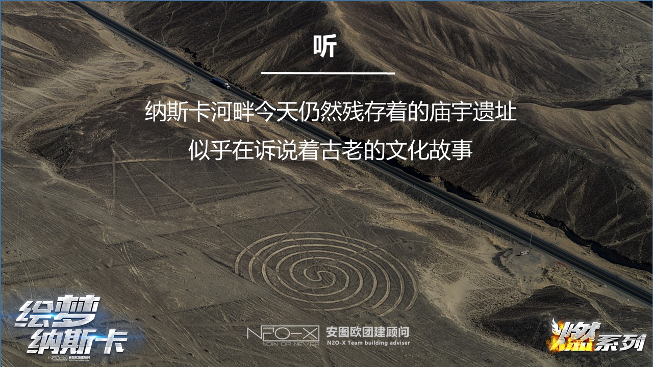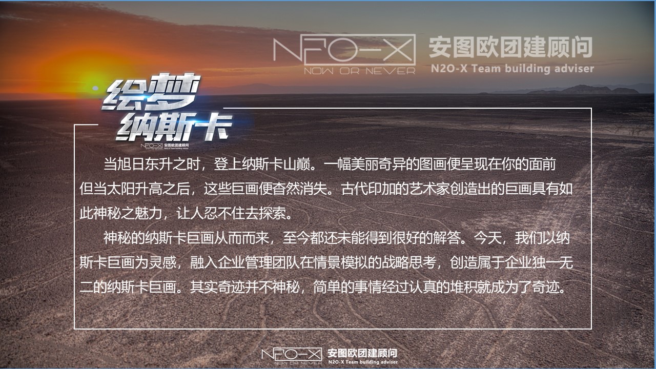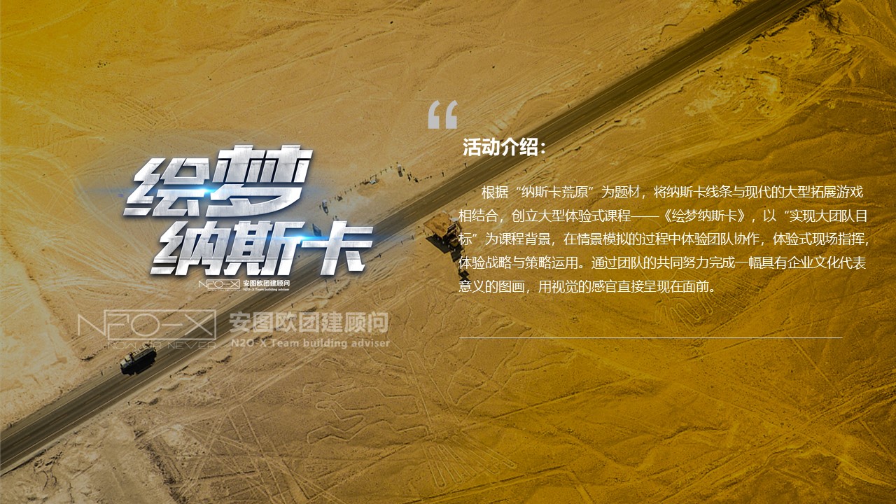 根據(jù)“納斯卡荒原”為題材,將納斯卡線條與現(xiàn)代的大型拓展游戲相結(jié)合,創(chuàng)立大型體驗(yàn)式課程——《繪夢納斯卡》,以“實(shí)現(xiàn)大團(tuán)隊(duì)目標(biāo)”為課程背景,在情景模擬的過程中體驗(yàn)團(tuán)隊(duì)協(xié)作,體驗(yàn)式現(xiàn)場指揮,體驗(yàn)戰(zhàn)略與策略運(yùn)用。通過團(tuán)隊(duì)的共同努力完成一幅具有企業(yè)文化代表意義的圖畫,用視覺的感官直接呈現(xiàn)在面前。