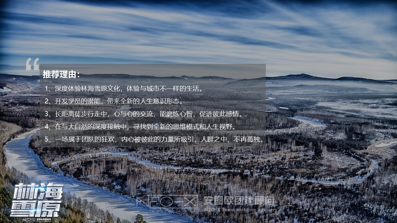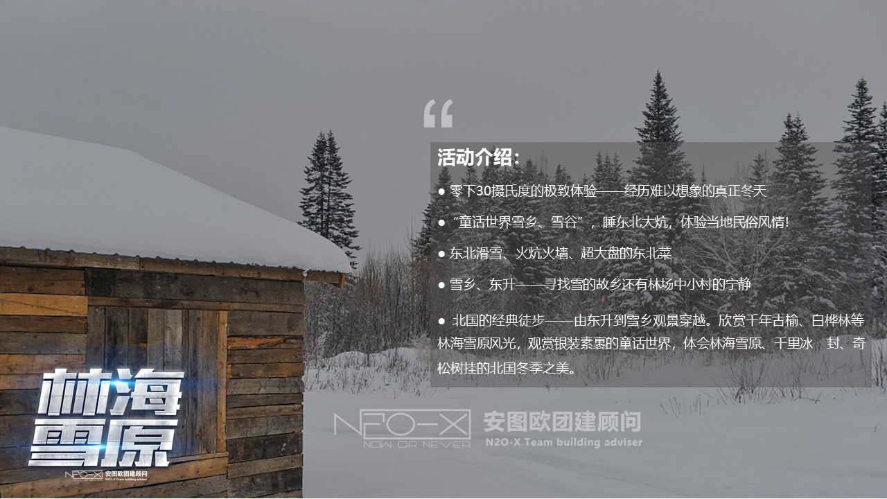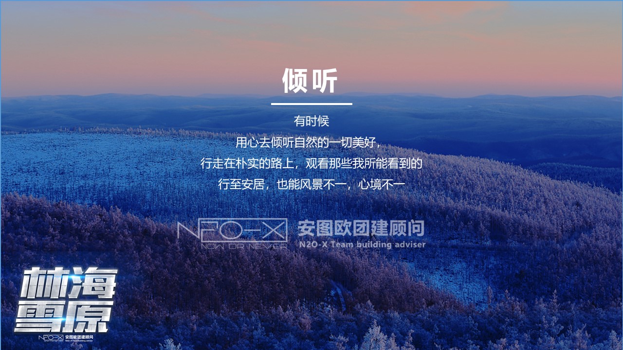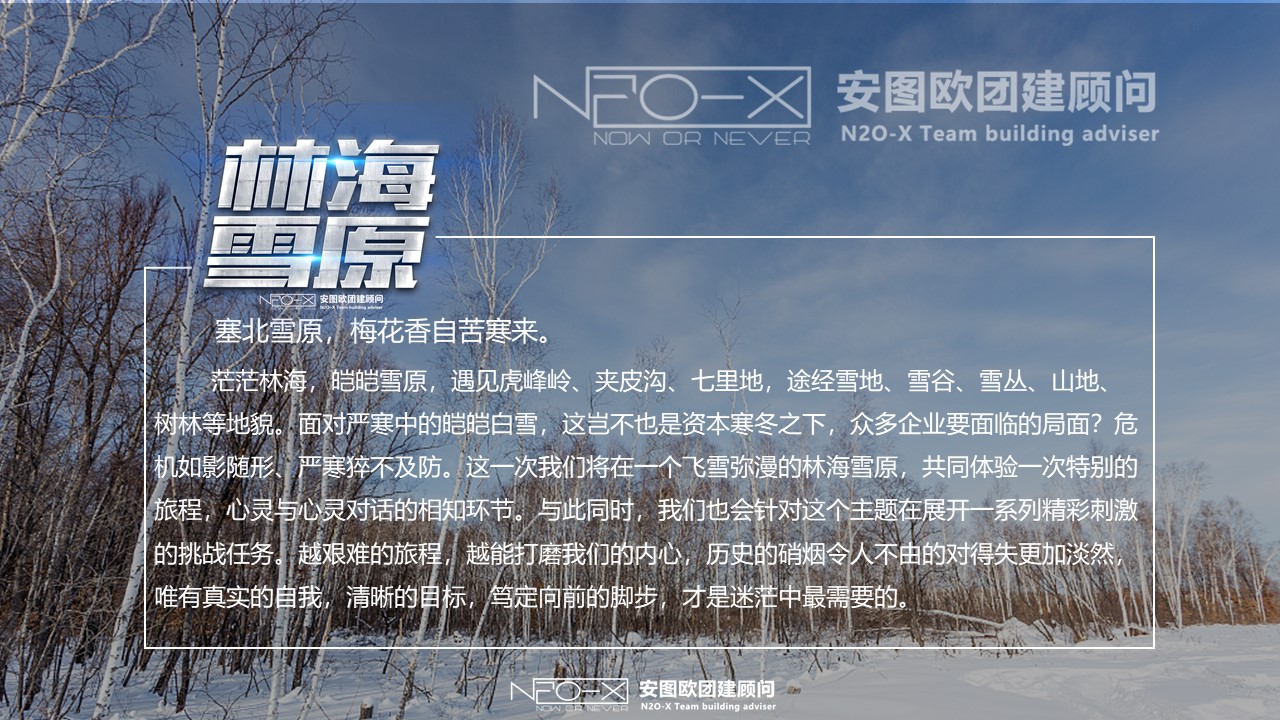 茫茫林海,皚皚雪原,遇見虎峰嶺、夾皮溝、七里地,途經(jīng)雪地、雪谷、雪叢、山地、樹林等地貌。面對(duì)嚴(yán)寒中的皚皚白雪,這豈不也是資本寒冬之下,眾多企業(yè)要面臨的局面?危機(jī)如影隨形、嚴(yán)寒猝不及防。這一次我們將在一個(gè)飛雪彌漫的林海雪原,共同體驗(yàn)一次特別的旅程,心靈與心靈對(duì)話的相知環(huán)節(jié)。與此同時(shí),我們也會(huì)針對(duì)這個(gè)主題在展開一系列精彩刺激的挑戰(zhàn)任務(wù)。越艱難的旅程,越能打磨我們的內(nèi)心,歷史的硝煙令人不由的對(duì)得失更加淡然,唯有真實(shí)的自我,清晰的目標(biāo),篤定向前的腳步,才是迷茫中最需要的。