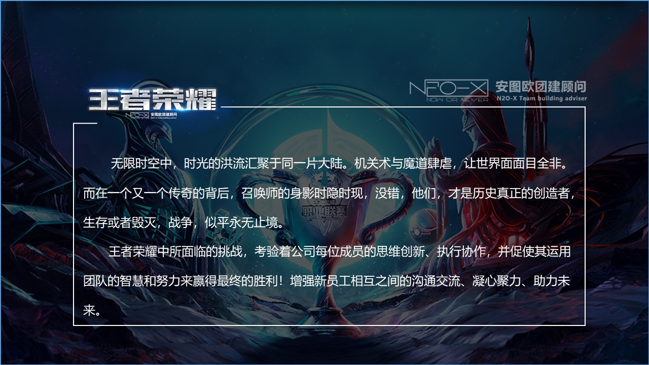 王者榮耀中所面臨的挑戰(zhàn),考驗(yàn)著公司每位成員的思維創(chuàng)新、執(zhí)行協(xié)作,并促使其運(yùn)用團(tuán)隊(duì)的智慧和努力來(lái)嬴得最終的勝利!增強(qiáng)新員工相互之間的溝通交流、凝心聚力、助力未來(lái)。