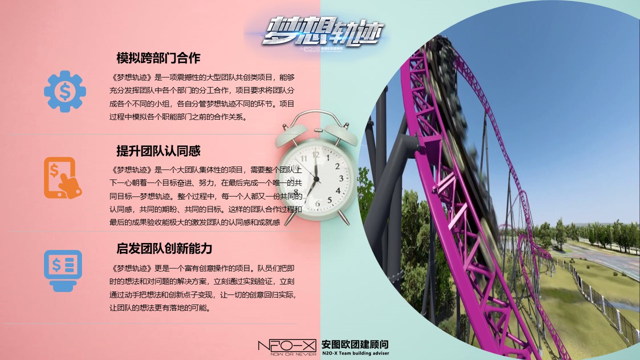 超大型團(tuán)隊(duì)創(chuàng)意體驗(yàn)項(xiàng)目之《夢(mèng)想軌跡》,在精心設(shè)計(jì)的項(xiàng)目中,結(jié)合過(guò)山車(chē)的主題,用一道道項(xiàng)目挑戰(zhàn)每一位學(xué)員的決心和恒心。從體力、智力、承受力各方面給學(xué)員加以體驗(yàn)與感悟,激發(fā)團(tuán)隊(duì)潛能,提高團(tuán)隊(duì)工作熱情,增強(qiáng)團(tuán)隊(duì)凝聚力及同事之間相互配合的團(tuán)隊(duì)意識(shí)。團(tuán)隊(duì)成員將一起設(shè)計(jì)和創(chuàng)造這個(gè)世界上最令人興奮和最具創(chuàng)意的過(guò)山車(chē)。