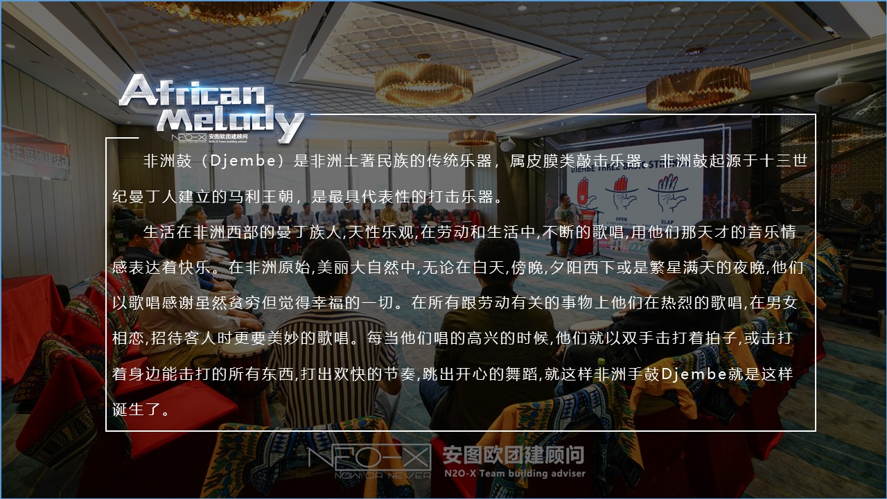 生活在非洲西部的曼丁族人,天性樂觀,在勞動和生活中,不斷的歌唱,用他們那天才的音樂情感表達著快樂。在非洲原始,美麗大自然中,無論在白天,傍晚,夕陽西下或是繁星滿天的夜晚,他們以歌唱感謝雖然貧窮但覺得幸福的一切。在所有跟勞動有關(guān)的事物上他們在熱烈的歌唱,在男女相戀,招待客人時更要美妙的歌唱。每當他們唱的高興的時候,他們就以雙手擊打著拍子,或擊打著身邊能擊打的所有東西,打出歡快的節(jié)奏,跳出開心的舞蹈,就這樣非洲手鼓Djembe就是這樣誕生了。