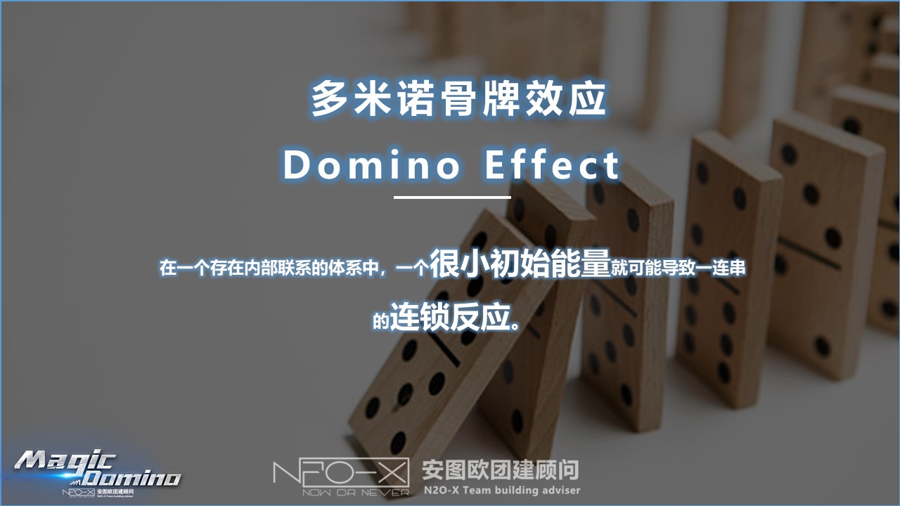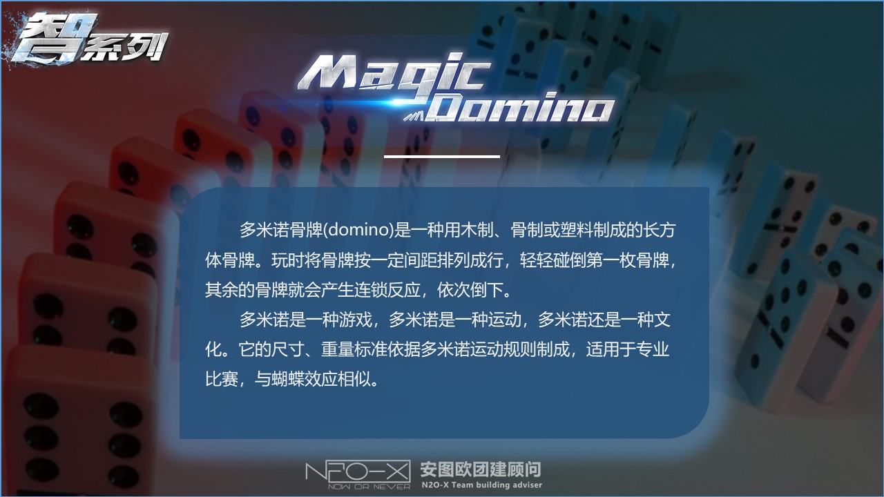 多米諾骨牌(domino)是一種用木制、骨制或塑料制成的長方體骨牌。玩時將骨牌按一定間距排列成行,輕輕碰倒第一枚骨牌,其余的骨牌就會產(chǎn)生連鎖反應,依次倒下。