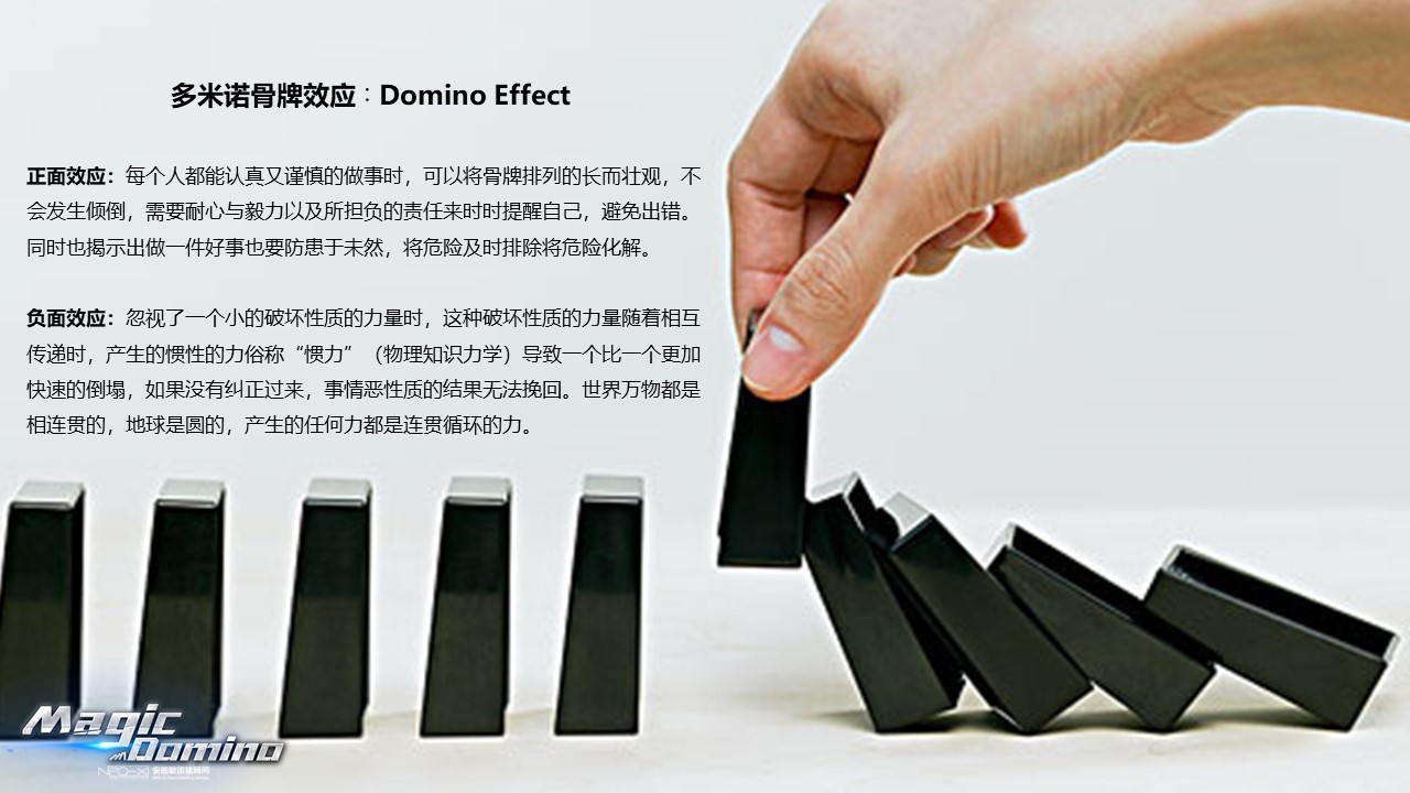 正面效應:每個人都能認真又謹慎的做事時,可以將骨牌排列的長而壯觀,不會發(fā)生傾倒,需要耐心與毅力以及所擔負的責任來時時提醒自己,避免出錯。同時也揭示出做一件好事也要防患于未然,將危險及時排除將危險化解。
